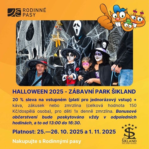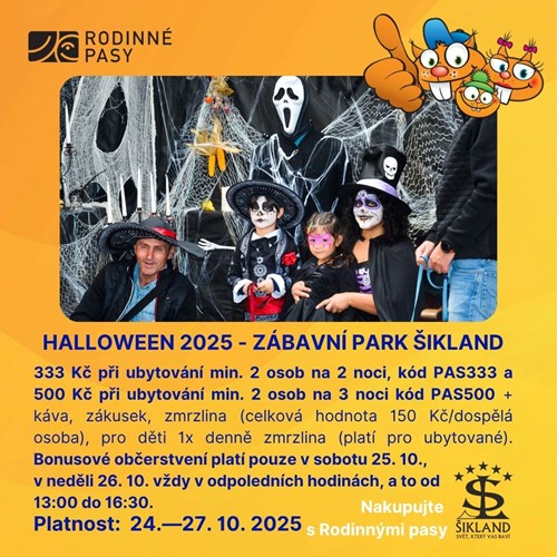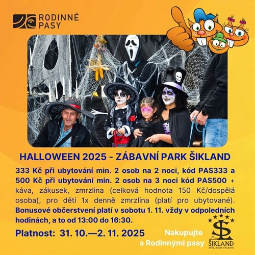 Máme pro vás připravenu slevu 20 % na jednodenní vstupné. Slevu uplatněte až přímo na pokladně při vstupu do Šiklandu. A pokud se strašidly chcete pobýt, můžete využít slevu 333 Kč při pobytu na dvě noci pro minimálně dvě osoby (slevový kód PAS333), na tři noci pak 500 Kč (slevový kód PAS500). Slevové kódy uplatněte při rezervaci.