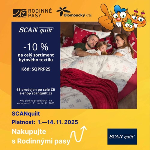 Jde o časově omezenou nabídku - 10 % od našeho partnera SCANquilt. Konec roku je období, kdy je ideální čas zpomalit, zachumlat se do měkké deky či přikrývky a užívat si hřejivé chvíle doma v kruhu svých nejbližších. Česká značka SCANquilt přináší do našich domovů krásu, kvalitu, pohodlí a styl už od roku 1992. Každý výrobek je výsledkem poctivého řemesla, precizního zpracování, pečlivě vybraného materiálu a designu, který sleduje aktuální trendy i osvědčenou klasiku. Stylové povlečení, přikrývky, polštáře, prostěradla, deky a přehozy, osušky a další bytové doplňky, které v sobě snoubí špičkovou kvalitu, moderní design a praktickou funkčnost, promění každý domov v útulné a osobité místo. Přijďte si vybrat do jedné z našich 65 prodejen po celé ČR, nebo si objednejte z pohodlí domova na e-shopu scanquilt.cz.