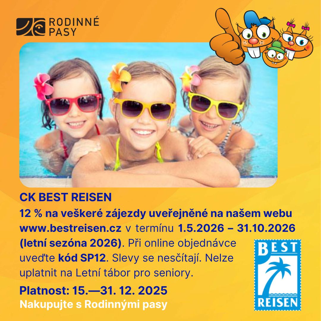 - 12 % na veškeré zájezdy uveřejněné na našem webu www.bestreisen.cz v termínu 1. 5. 2026 – 31. 10. 2026 (letní sezóna 2026).
